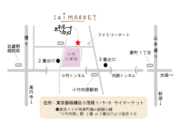 サイギャラリーを備えるサイマーケットは、カフェレストラン「vivo daily stand小竹向原店」・お花屋さん「Flower Shop Ruby Tuesday」・オーガニック食材及び日用品販売・レンタルスタジオの複合店舗です。
