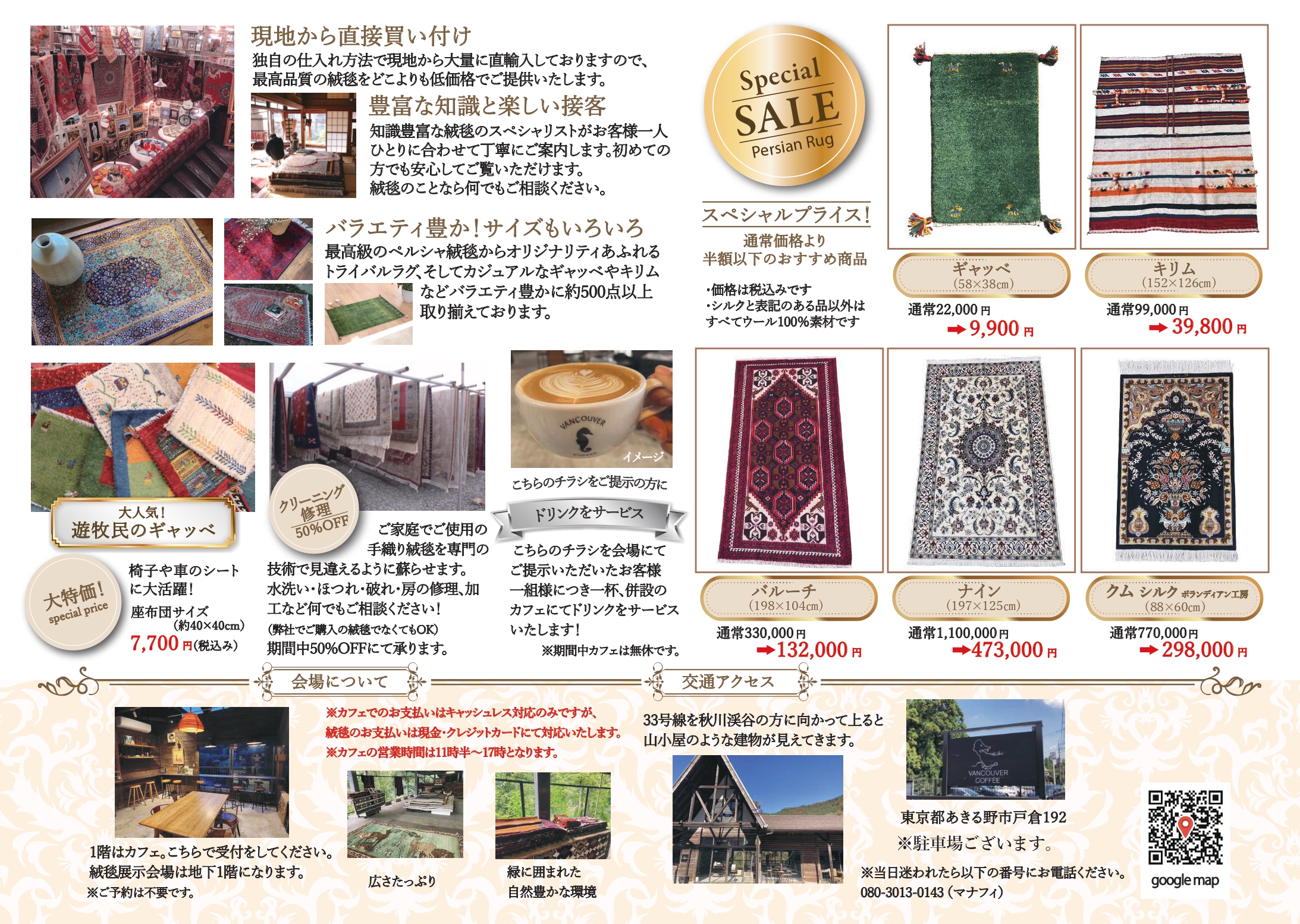 【11/27(木)- 30(日)東京都あきる野市】紅葉に包まれたロッジ風カフェで色とりどりの絨毯500点以上がお買得な4日間!