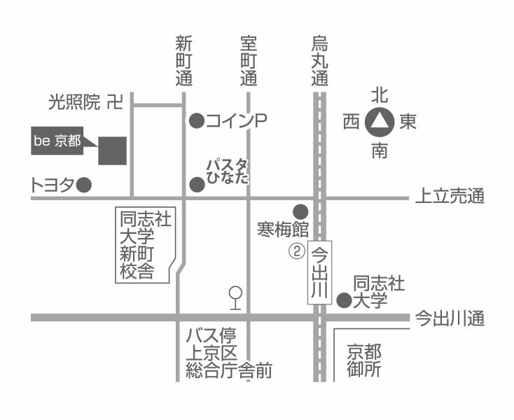 会場となる「アートスペース be京都」は、同志社大学新町校の北に位置し、門跡寺院「光照院」に隣接しています。
