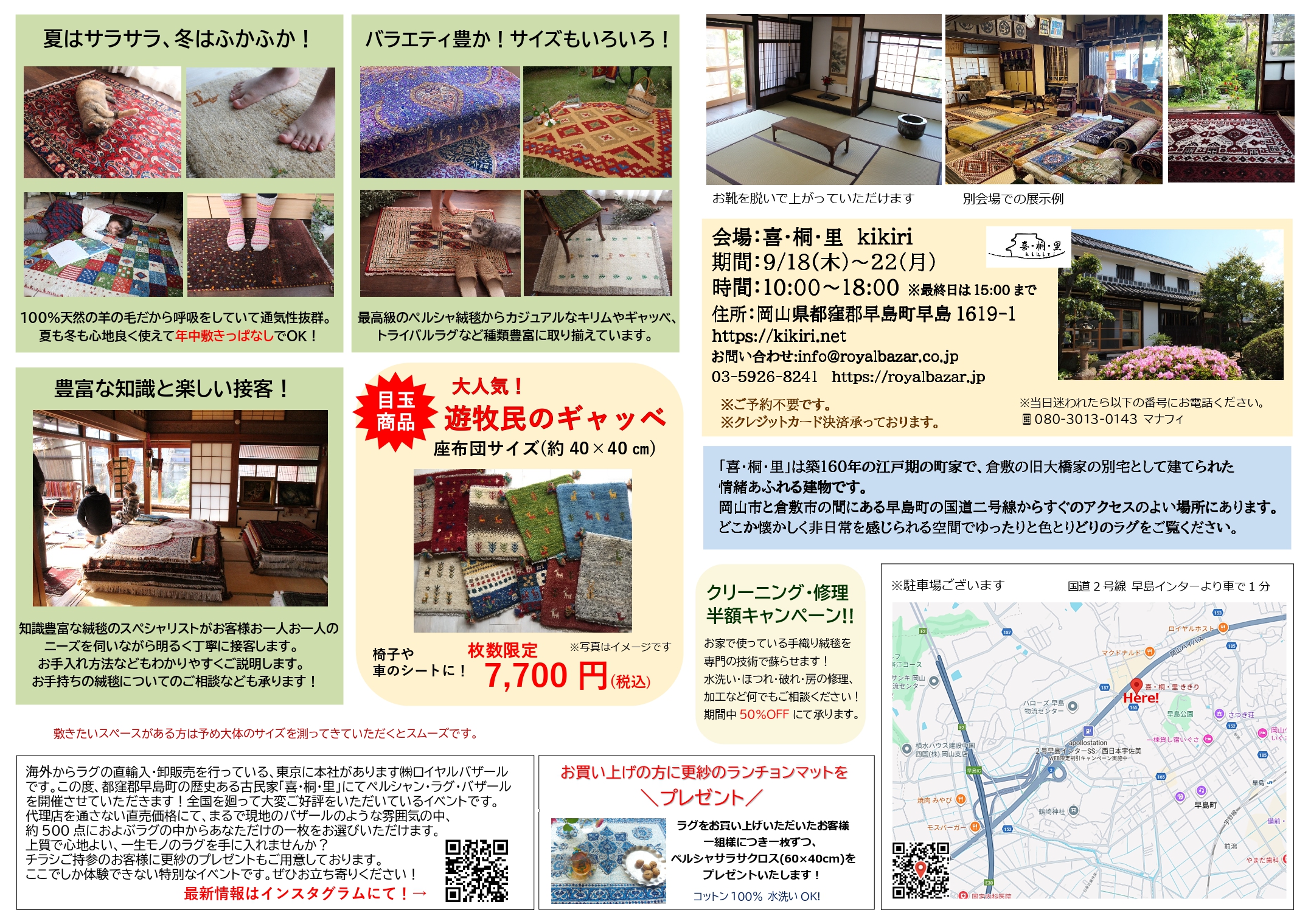 【9/18(木)- 22(月)岡山県都窪郡早島町】岡山初開催!江戸時代に建てられた古民家で直輸入卸価格のペルシャ絨毯展を開催!