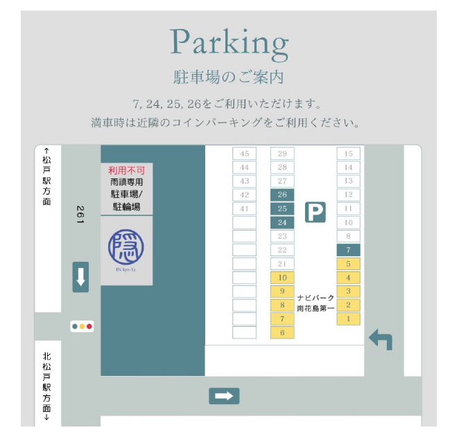 なお、万が一駐車区画が埋まっている場合は恐れ入りますが近隣のコインパーキングをご利用ください。