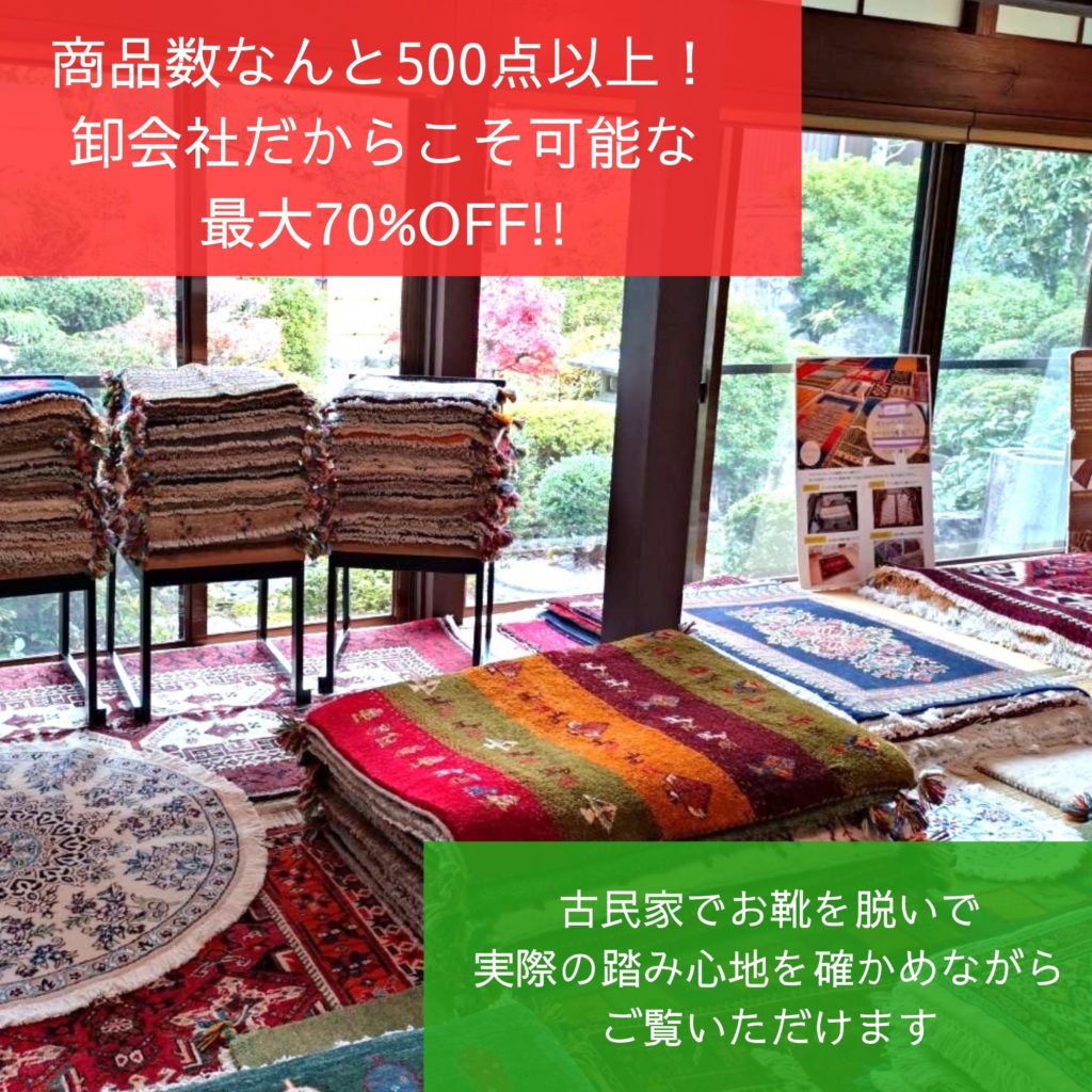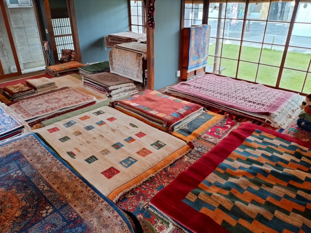 特に日本の伝統的家屋の古民家が会場の場合、お靴を脱いで上がっていただき、畳の上に座りながら絨毯をご覧いただけます。