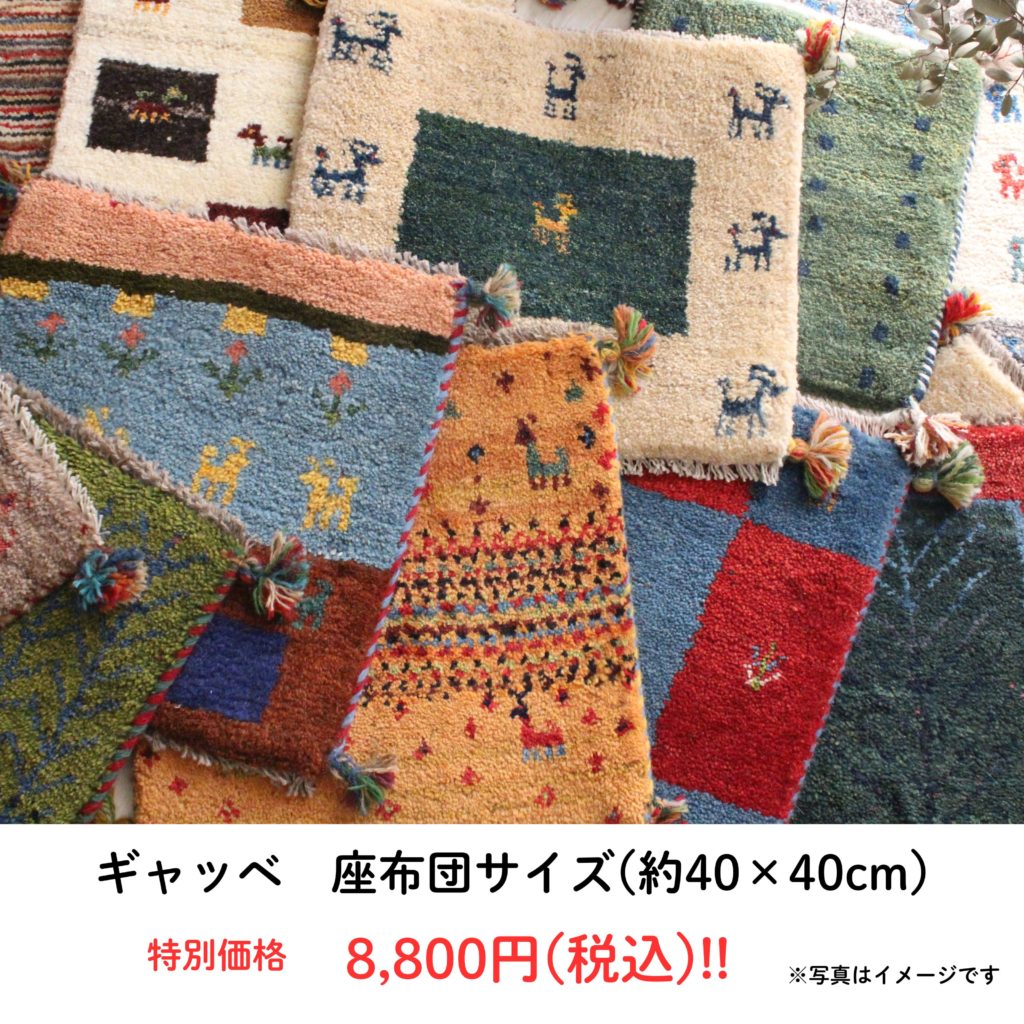 たくさんのサイズ、種類のラグを展示いたしますが、大人気のギャッベ座布団サイズ(約40×40㎝)は8,800円(税込)でお買得です!