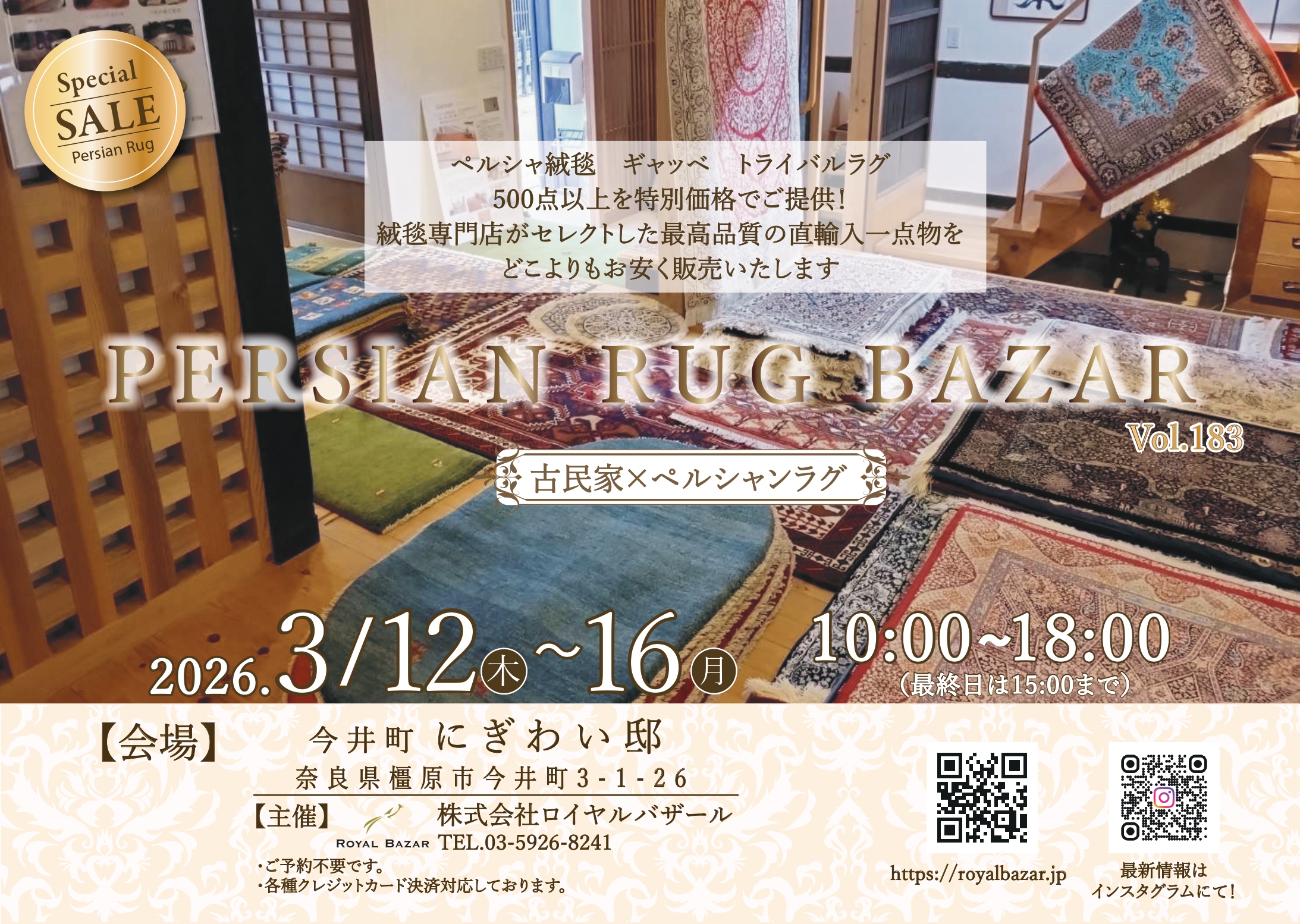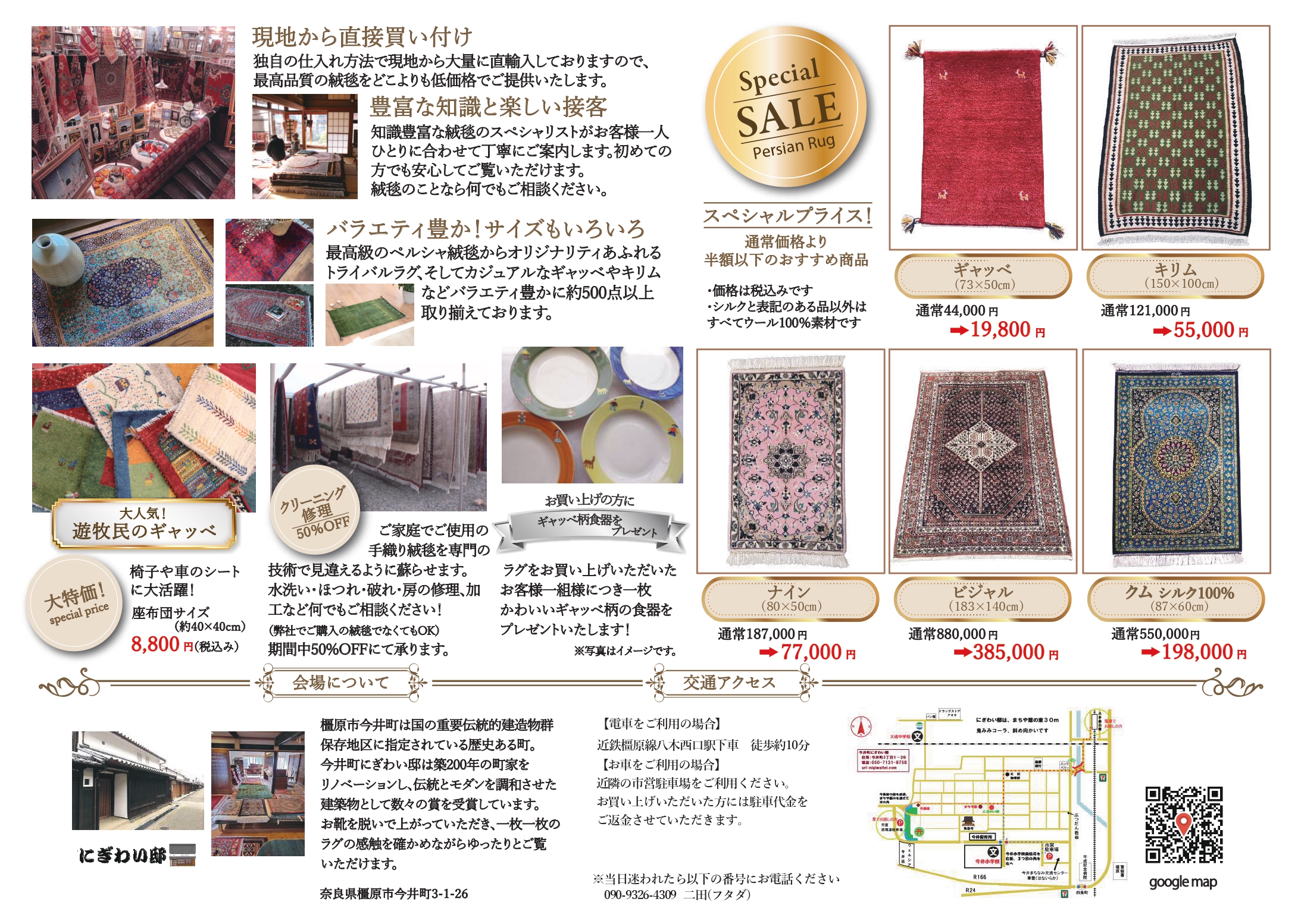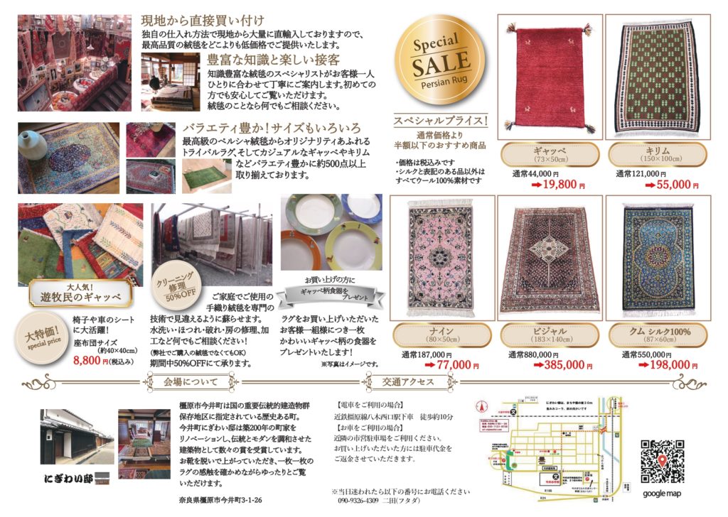 【3/12(木)-16(月)奈良県橿原市】街全体がまるで江戸時代!一点物の直輸入手織り絨毯500点以上が最大70%OFF、日本とペルシャの歴史のコラボレーション